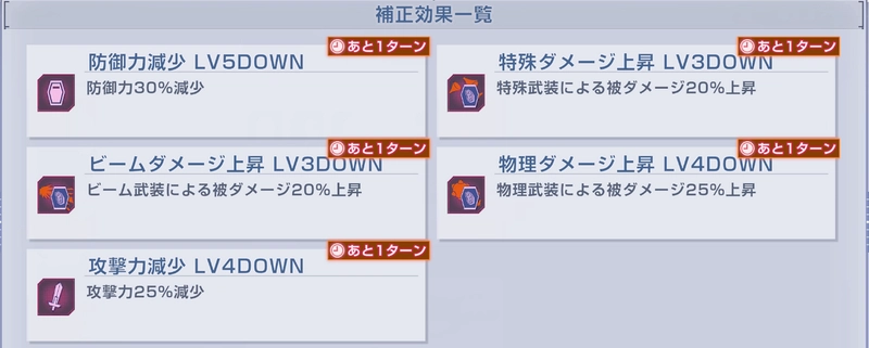 自ターンが回ってきたら、まず最初に各種防御デバフ系効果のある武装(防御ダウン、物理デバフ、ビームデバフ、特殊デバフ)を使い、ボスにデバフを付与しよう。