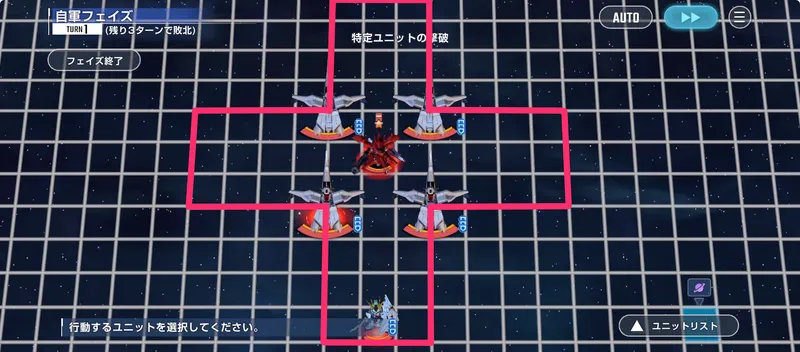 内側に配置した移動力5・射程5の機体なら初動から狙うことができるが、νガンダム近くの敵機体を狙えば支援防御してくれるのでどちらかの方法でさっさと倒してしまおう。