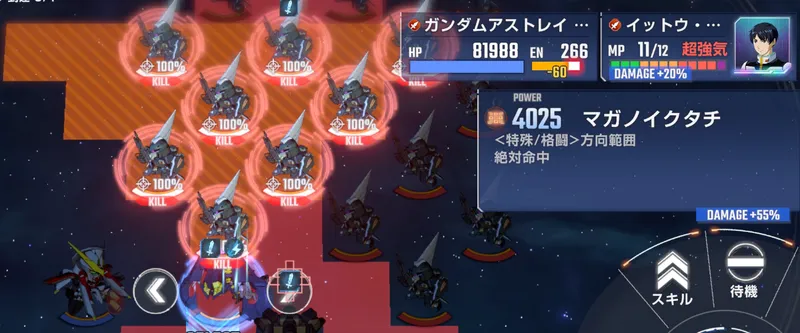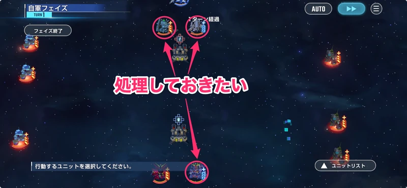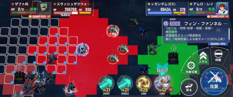 雑魚敵が5機ずつ配置されており、撃破してCSを発動させることで各ユニットのバフ範囲まで配置できる。