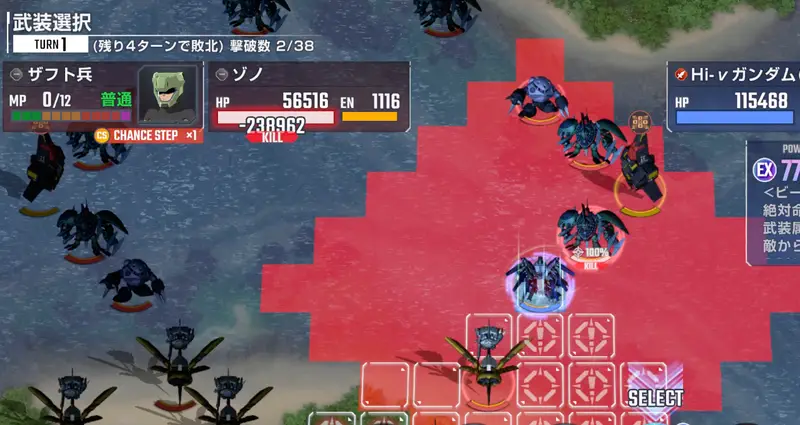 3ターンしかない上、HPを0にすると一度だけ全回復する厄介なアビリティを所持しているため、効率よく機体を進めていく必要がある。