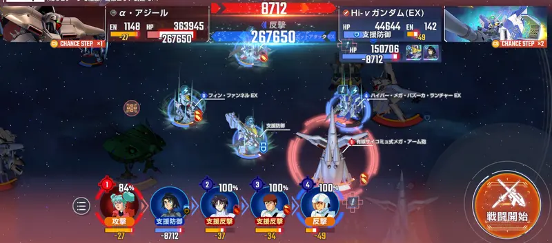・宇宙ステージ ・「マーク・ギルダー(フェニックスガンダム)」撃破が目標 └一度だけHP0時に全回復する ・1ターン目で支援攻撃持ちを可能な限り倒す └無条件CS2回持ち └火力が高く、支援参加時の攻撃力+80% └マップ兵器でまとめて処理が可能 ・ハロが邪魔 └中央のハロのみ処理が良い └移動型マップ兵器で奥のバフを使えると強力 ・防御ドムを踏みながら上に進軍する └支援ドムの届かない配置から攻撃しよう ・2ターン目におかわりジムが出現 └2ターンクリアが厳しいなら処理する必要あり └ハロを処理しすぎると処理できなかったジムが乗り込んできてしまう ・量産型ビグザムを踏んで最深部の配置をする ・フェニックスゼロを倒してからフェニックスガンダムを倒す ▶︎17階の詳しい攻略解説はこちら |