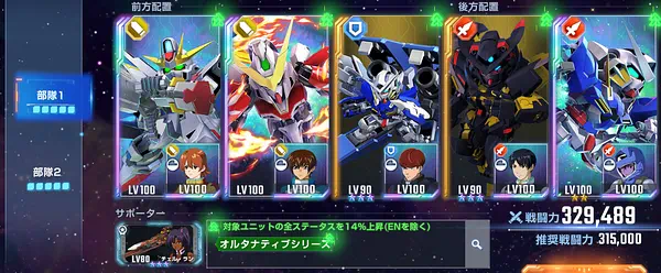 | 【左部隊】 ・キュリオス以外は脱出持ち └GNアーマー2機は脱出後に支援防御持ちに変化 └ヴァーチェ撃破後のナドレは敵全体攻撃/防御バフ持ち |