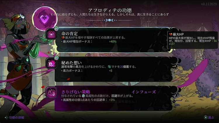 ヘラの功徳「花嫁の輝き」や「育ちの良さ」では取得済みの功徳のレベルを上げることが可能。