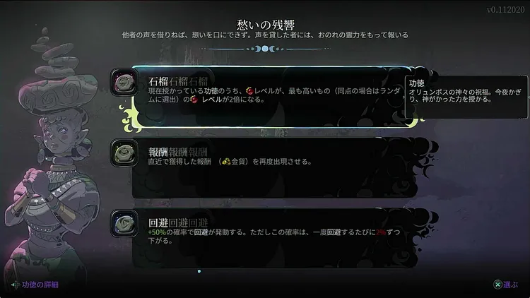 赤くて丸い果物のようなアイテムを取得すると、所持している功徳の中から最大3つが提示され、選んだ1つの功徳レベルを1上げることが可能。
