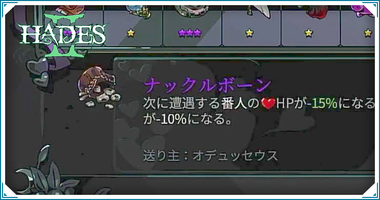 また、エリア内に出現するカロンのショップでは、「石榴のスライス」が売っていることもあり、取得すると所持している功徳の中からランダムな1つのレベルが1上がる。