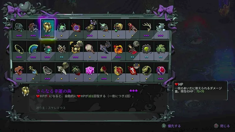 生存力を上げられる賜物「さらなる幸運の歯」や「蜘蛛糸の飾り帯」を装備し、1発2発耐えられる回数が増えるだけでも勝利につながりやすいのでおすすめ度は高め。