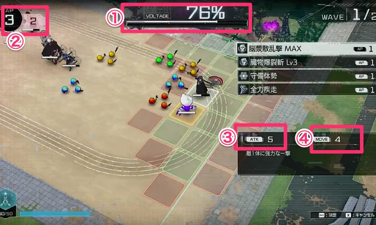 | ①VOLTAGE | 100%溜めることで強力な行動が選択できるようになる |