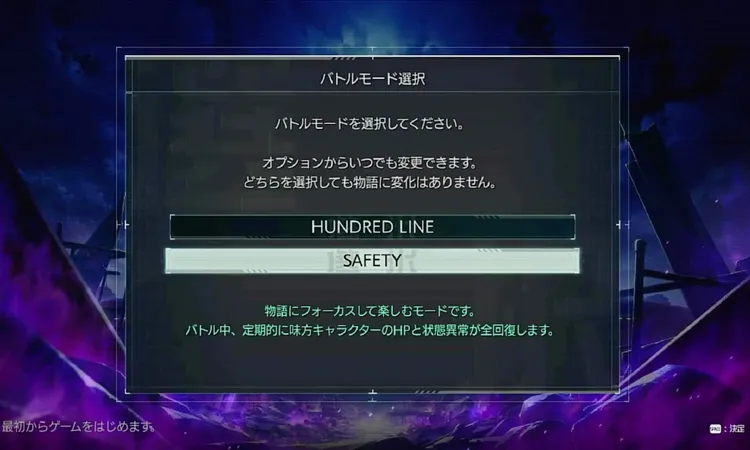 SAFETYモードを選択することで、バトルの難易度を大きく落とし、さくさく物語を読み進めることができる。しかし、あくまで初見プレイ時に推奨されているのは通常モードのHUNDRED LINEなので、どうしても詰まってしまったり、周回プレイ時のみの手段にしておくのがおすすめだ。