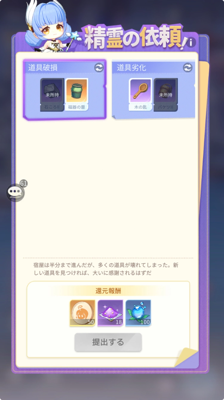 精霊から出される依頼を達成することで「精霊育成素材」と「精霊コイン」をゲットできる。