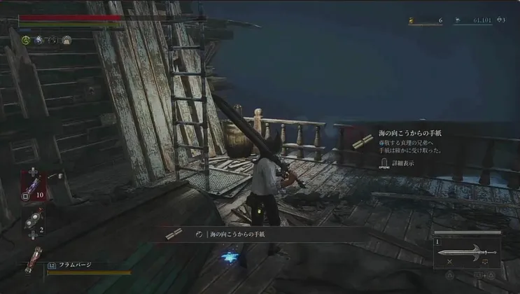 2つ目に通る難破船のハシゴは寄り道ルートだが、リージョンキャリバーが入手できるので一応探索しておこう。また、ハシゴ付近に落ちている「海の向こうからの手紙」を読むと深いお辞儀(ジェスチャー)が入手できる。