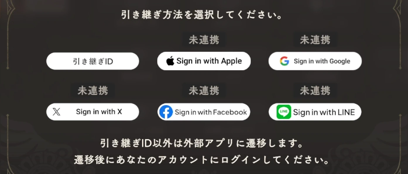 ゲーム内のメニューからデータ引き継ぎを選択し、好きなSNSとまどドラをデータ連携しよう。