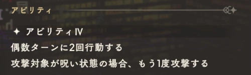 | アビリティ | 【アビリティⅣ】 偶数ターンに2回行動する 攻撃対象が呪い状態の場合、もう1度攻撃する |
