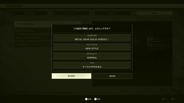「NEW GAME」を選択すると、4種類の設定(実質3種)を選択した後にゲームがスタートする。