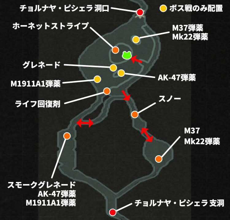 ザ・ペイン戦のエリアは、スネークが水中から登ることができる足場が2個所ある。ザ・ペインの蜂攻撃は発動後一箇所にとどまるので、定期的に足場を行き来しながら戦うのがおすすめだ。