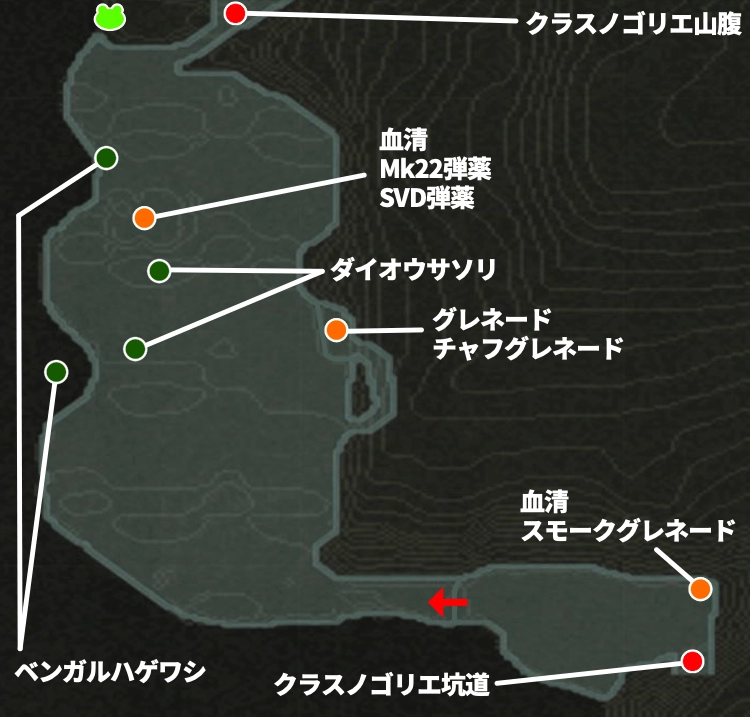 基地側の鉄塔にケロタンがある。SVDを装備し、倍率を上げた状態で狙撃しよう。