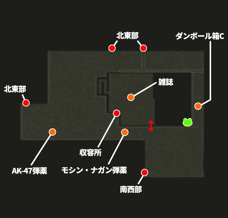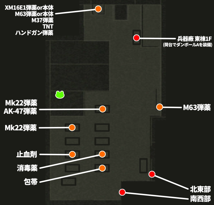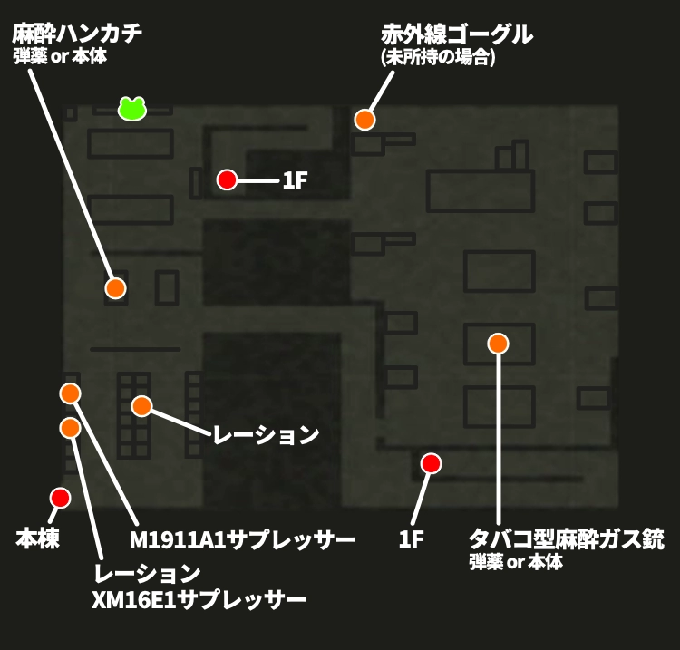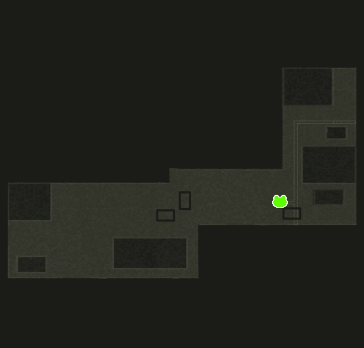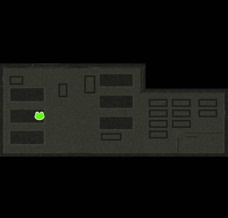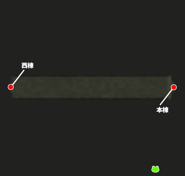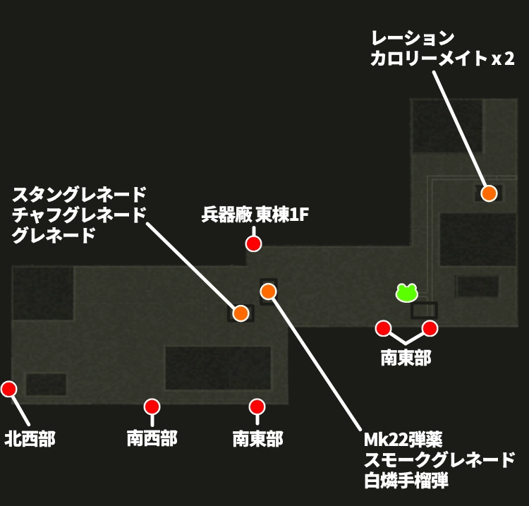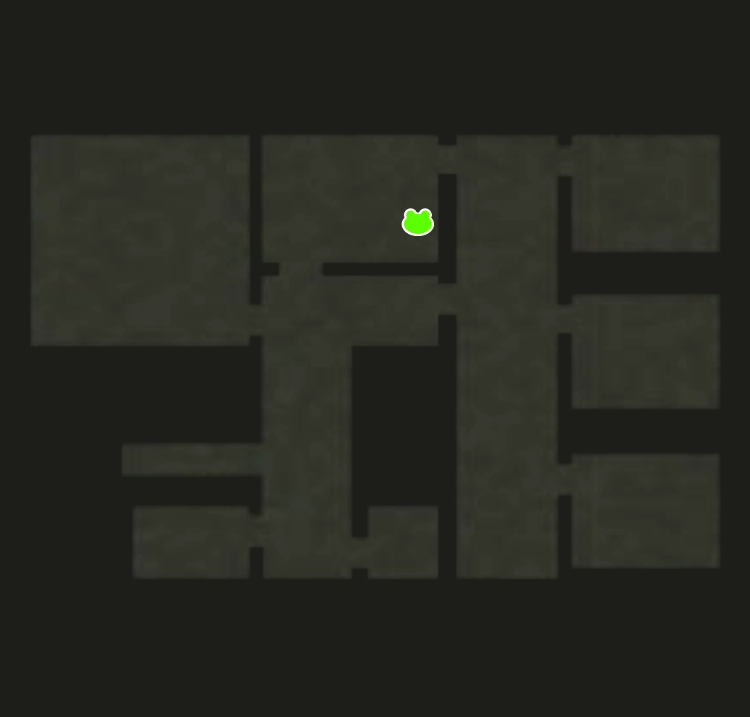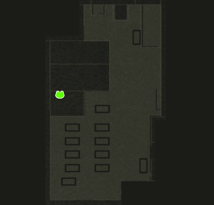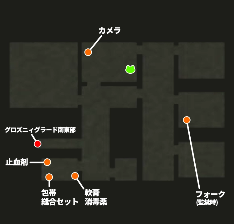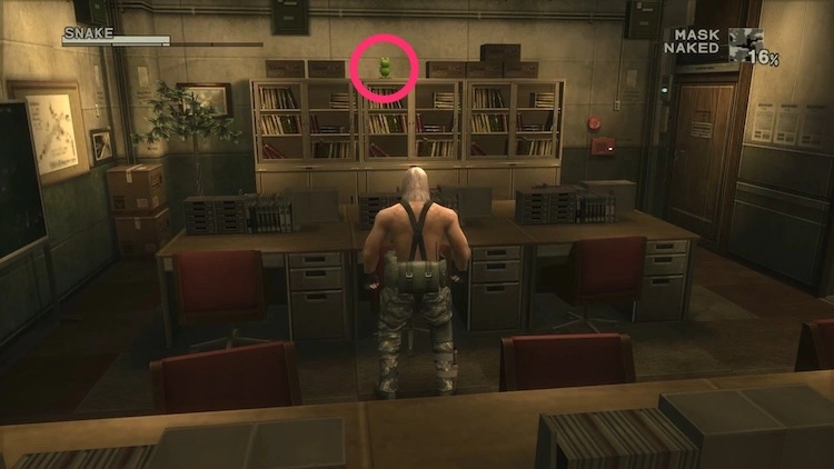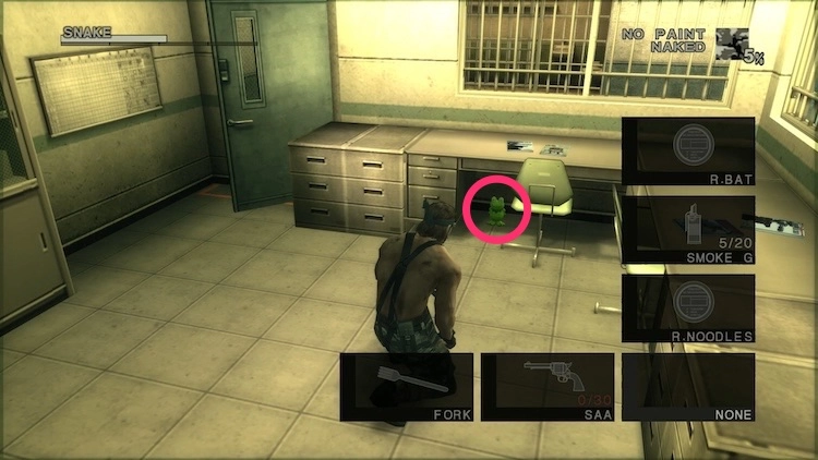 北側の部屋の机の下にケロタンがある。銃を持っていないため、看守から入手できるスモークグレネードを投げて当てよう。