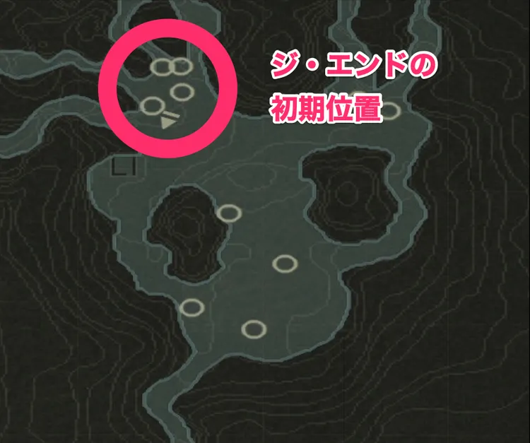 ジ・エンド戦開幕直後、ジ・エンドは南部(初期マップ)の北側の高台の上に隠れている。狙撃銃を使う場合はそのまま位置を確認して狙撃、スタミナキルを狙う場合は一度北部へ向かい、マップ南西の入口から南部へ戻ることでジ・エンドのいる高台に入りそのまま攻撃しよう。