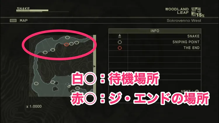 ジ・エンドは、各マップの特定場所にのみ待機している。ジ・エンドの待機場所(SNIPING POINT)は、一度通過した場所であればマップから確認可能。先に全エリアをくまなく探索しておくことで、ジ・エンドが居そうな位置を確認しやすい。