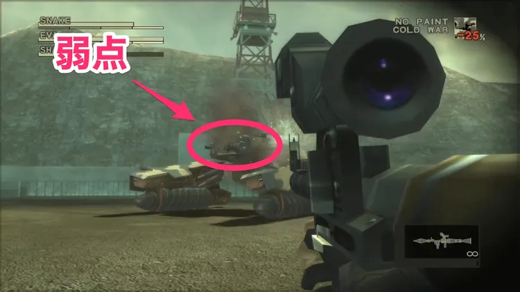 キャタピラにRPG-7で攻撃することで、一時的に回転を止めて背部へと回り込めるようになるので、戦闘が開始したらすぐにRPG-7を装備してキャタピラを狙って攻撃しよう。