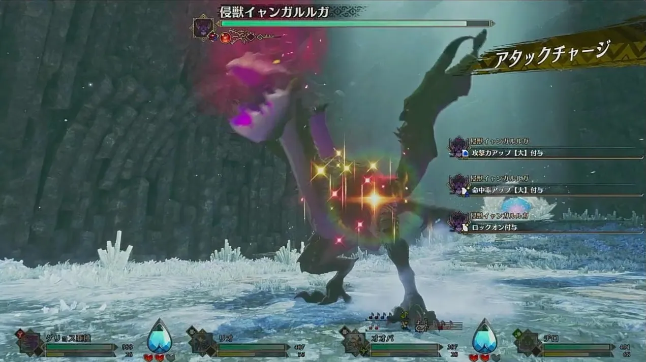 侵獣イャンガルルガは、怒り時(パターンA)の時アタックチャージを3回連続で使用するのでこのタイミングでバフの付与、絆ケージ稼ぎ、竜気ゲージの調整などを行おう。勿論ダメージを稼いでもOK。