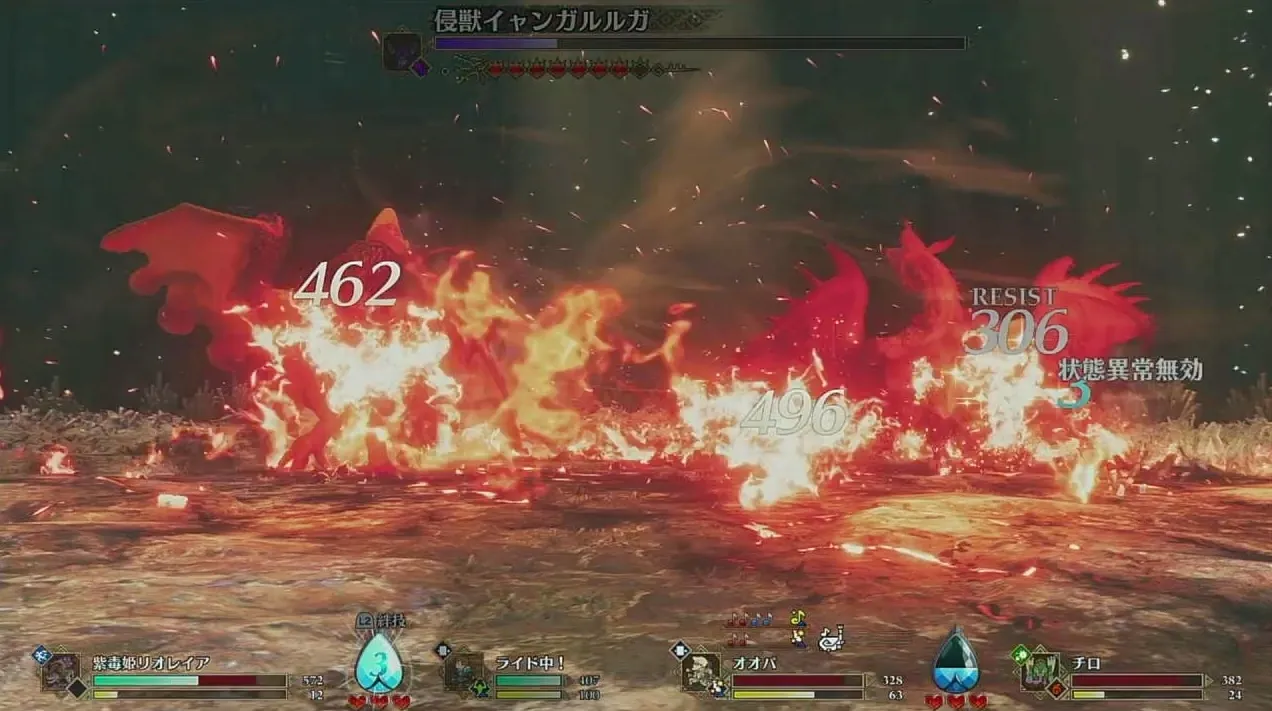 侵獣イャンガルルガのHPが3割程度になると、通常時の攻撃パターンが変化し、フレアブラスト(全体攻撃・確率で火傷)を連打してくるようになる。低HPの時は通常時では非常に危険なので注意。