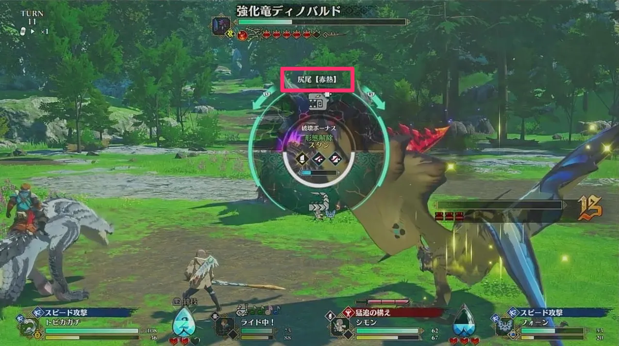 強化竜ディノバルドは、赤熱化している部位で攻撃タイプが変化する。現在の形態は攻撃部位選択画面で確認することができる。通常時はスピード喉が赤熱化している場合はパワー尻尾が赤熱化している場合はテクニック攻撃を使用してくる。