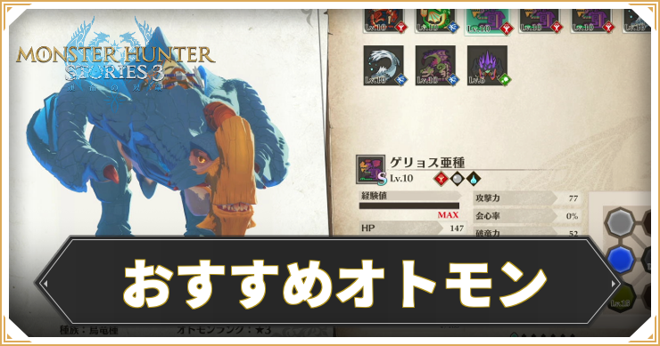 モンハンストーリーズ3(MHST3)の「おすすめキャラ」について掲載しています。おすすめパートナーやバトルメンバーについて掲載していますので、モンスターハンターストーリーズ3 〜運命の双竜〜の攻略にお役立てください。