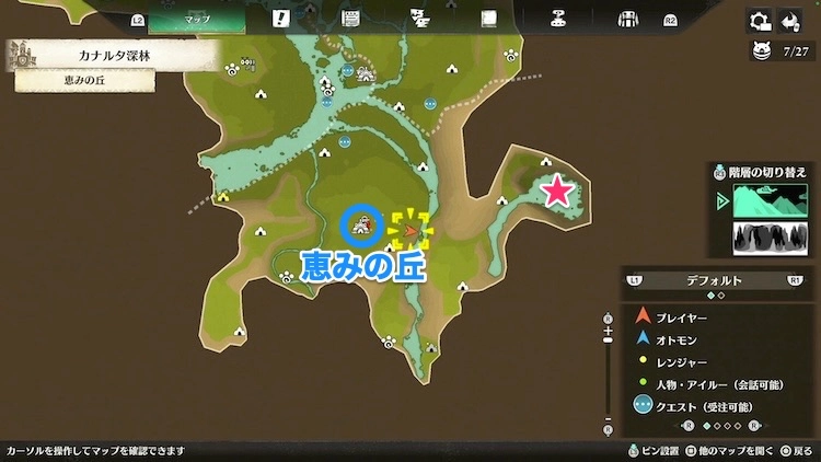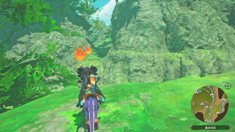 恵みの丘のキャンプから東へ進むと目印のカンロ虫がおり、飛行で向かいの崖へ飛ぶと川へ行くことができる。