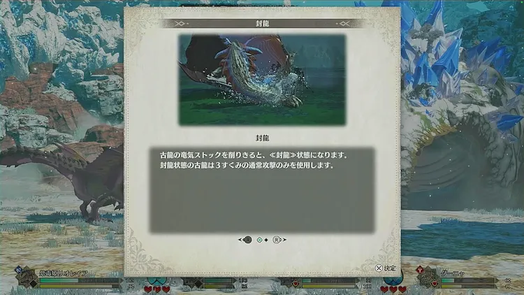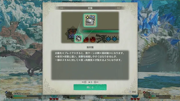 古龍との戦闘でブレイクをすると、数ターンの間「弱封龍」状態になり一部のスキルに対して真っ向勝負を狙うことができる。