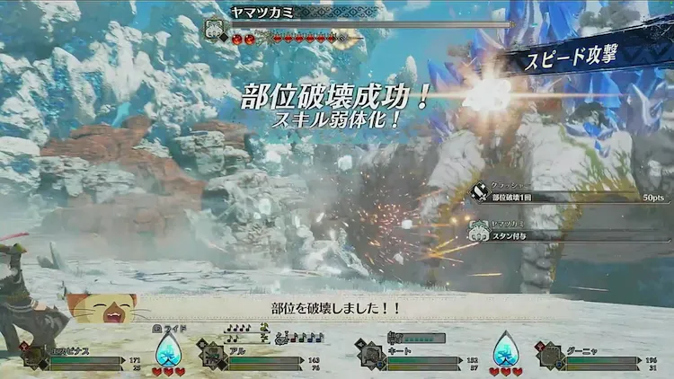 ヤマツカミは、通常時に大技として「触手大回転」を放ってくるが、絆技やブレイクで阻止することができないので部位破壊で弱体化しよう。