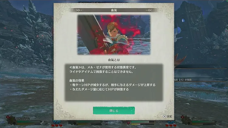 また、残り体力が少ない状態で血氣状態になってしまっても、毒や火傷などの他のターンダメージがある状態異常と異なり、血氣のダメージでHPが0になることはない。