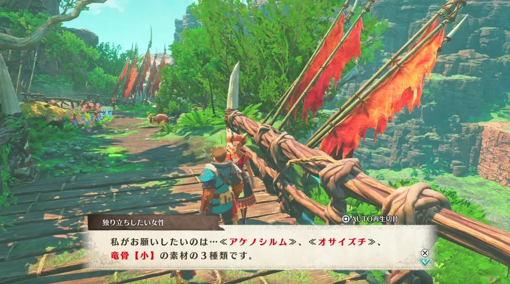 依頼人に「傘鳥の鱗」、「鎌鼬竜の毛」、「竜骨【小】」をそれぞれ3個納品をするとクエスト達成となる。素材を所持していない場合は、対応のモンスターを討伐して素材を集めよう。