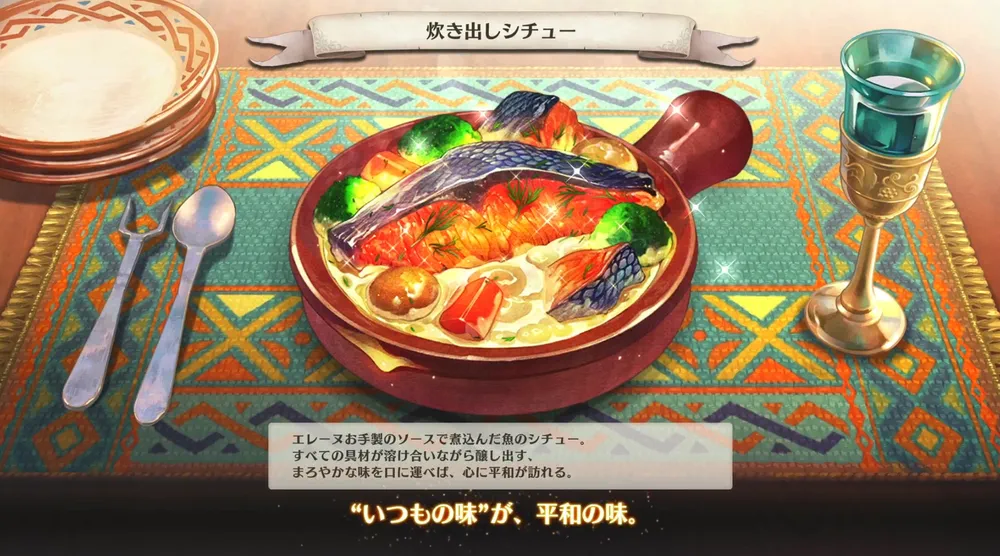 料理は万商屋の交易で交換できる「魚料理のレシピ2」を所持していれば作ることができる。