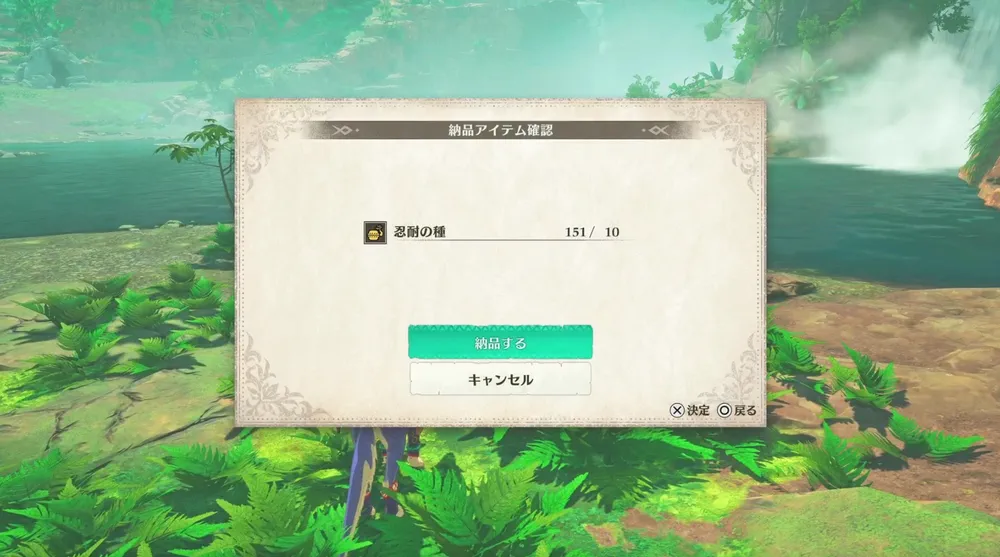 依頼人に忍耐の種を10個納品すればクエストクリアになる。これまでのストーリー進行である程度探索していれば余っているアイテムなため、そのまま報告してしまおう。