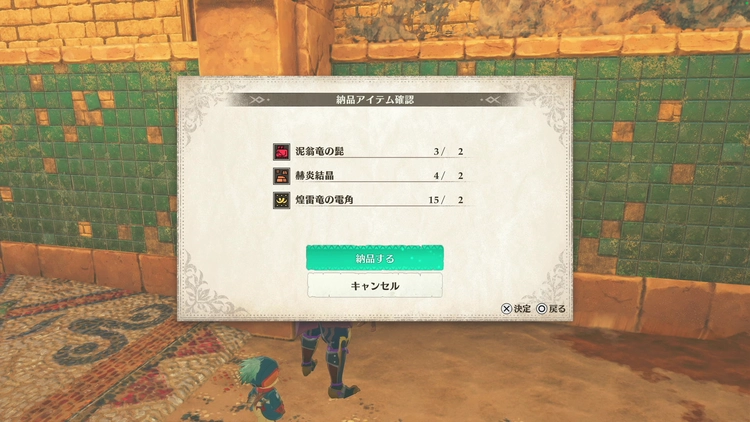 納品にはオロミドロ「泥翁竜のヒゲ」2個、アジャラカン「赫炎結晶」2個、レダウ「煌雷竜の雷角」2個が必要となる。