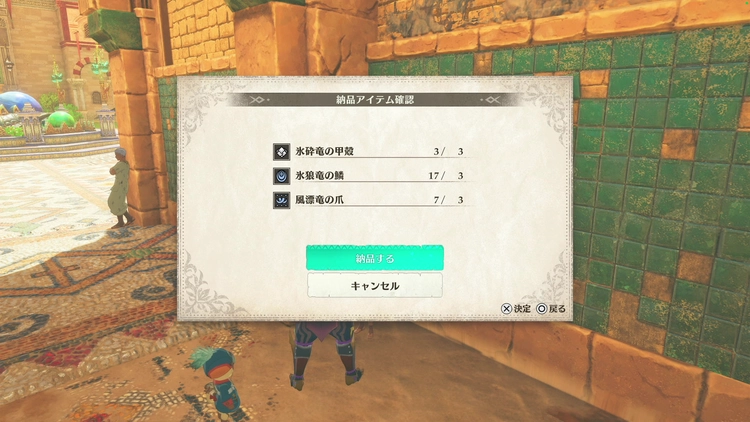 納品にはボルボロス亜種「氷砕竜の甲殻」3個、ルナガロン「氷狼竜の鱗」3個、レイギエナ「風漂竜の爪」3個が必要となる。