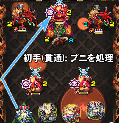 これまでと同じく制限雑魚を揃えてから同時処理をします。2ターン後に中ボスが左下に移動してしまうため、移動後の配置も考慮しつつどのキャラで雑魚を同時処理するかを決めておきましょう。