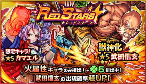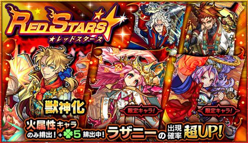 モンストにおける火属性限定ガチャ”RED STARS/レッドスターズ”のキャラガチャシミュレーターです。2022年1月までのすべての排出対象キャラが追加されています。
