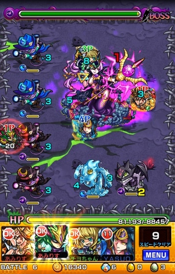 ヤマトタケルがカンカンして、イザナミでヤマトタケルの友情コンボを発動しつつ、右とボスの間に入ってカンカンでボスを即効逃がすことができましたー!