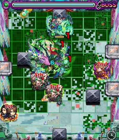 スイッチが4枚あり1枚は中央に配置されているため、これまで以上にLV管理が難しいステージです。スイッチを調整するだけのターンを複数回作ってでも、確実に雑魚処理・ボス火力を出せるように立ち回りましょう。