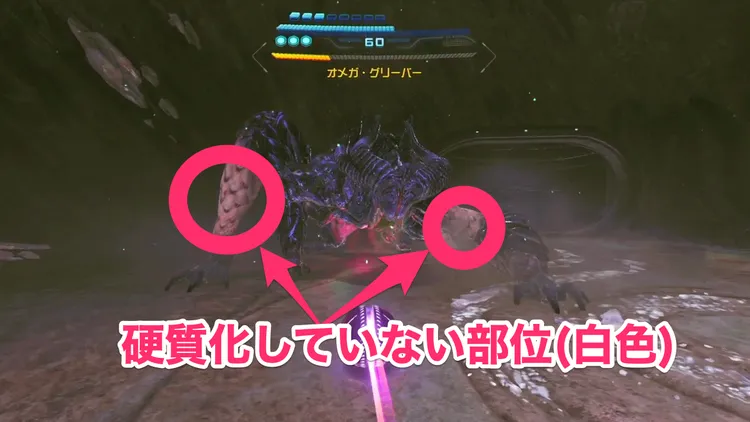 オメガ・グリーパーは通常時にダメージが通らないため、まずは硬質化していない部位を攻撃してダウンさせよう。