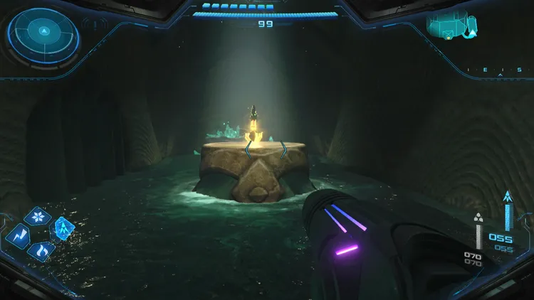 - 左の滝下の通路を進んだ先でミサイルタンクを入手