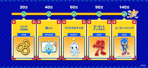 これにより、ゲーム内で使えるアイテムであるチャオの「嬉しい」ステッカーや、限定スキン「ムービーソニック」がもらえるなど、配布される特典が豪華になります。興味のある方はぜひゲーム内でチェックしておきましょう!
