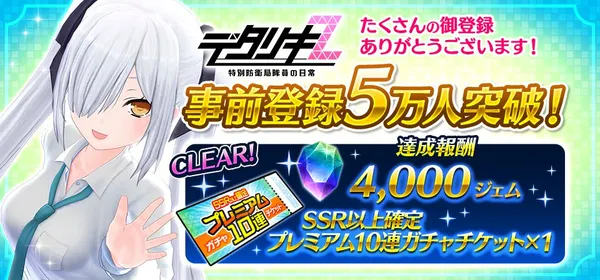 1月30日より開始された『デタリキ』の事前登録では、事前登録者数が見事5万人を突破したため、事前登録キャンペーンの全目標を達成しました!