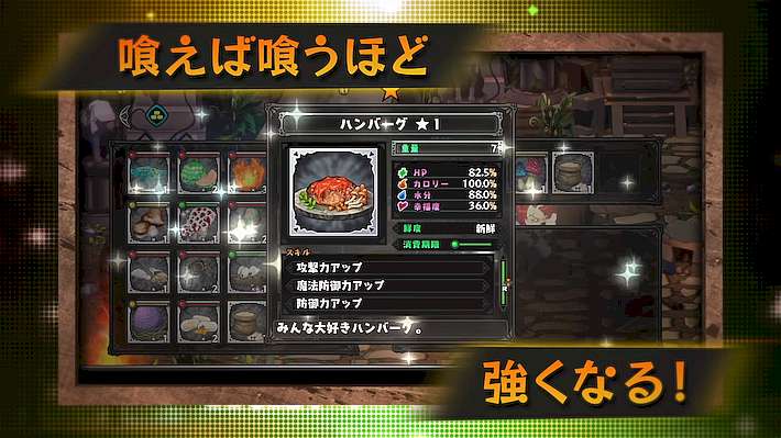 複数の食材を組み合わせて、キャラクターのステータスを上昇させる“料理”をつくることができます。さらに「調理スキル」の高いキャラクターがいれば、同じレシピでもより高い効果を発揮する料理に仕上げることができます。
