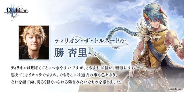 株式会社enish(本社:東京都港区、代表取締役社長:安徳 孝平、以下enish)は、2019年10月8日(火)、2019年配信予定のドラマチック共闘オンラインRPG『De:Lithe(ディライズ) ~忘却の真王と盟約の天使~』の公式サイトにて、ジョブに関する新しい情報を公開いたしました。また、Twitterにて、声優サイン色紙キャンペーン第五弾を、2019年10月8日(火)から10月14日(月)まで期間限定で開始いたしました。今回の賞品は、ゲーム内キャラクター ティリオン役を担当している勝 杏里さん、サクヤ役を担当している喜多村 英梨さんのサイン色紙です。