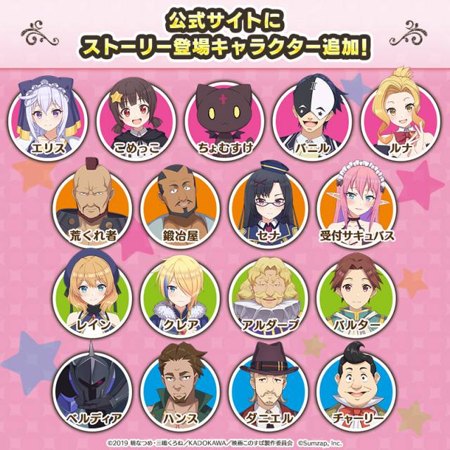 こめっこ、バニル、荒くれ者、エリスなど『このファン』のストーリーに登場するアニメ人気キャラクターや、原作でアイリスの付き人をしている魔法使いレイン(CV:上田麗奈)、アイリスの護衛をしている女騎士クレア(CV:矢作紗友里)を公開いたしました。また、元魔王軍で幹部に匹敵する実力者であるゲームオリジナルキャラクターのダニエル(CV: 速水奨)とダニエルの従者であるチャーリー(CV: 吉野裕行)も公式サイトにて初公開いたしました。