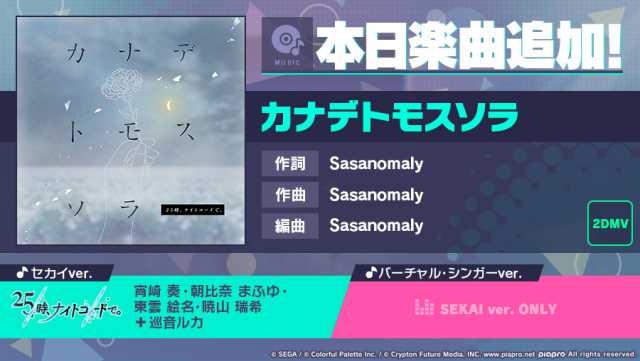 ササノマリイさんによる書き下ろし楽曲「カナデトモスソラ」を、『プロジェクトセカイ』の新たなリズムゲーム楽曲として追加いたしました。「カナデトモスソラ」は「25時、ナイトコードで。」のユニット楽曲で、ゲーム内の「プレゼント」からどなたでも受け取ることができます。