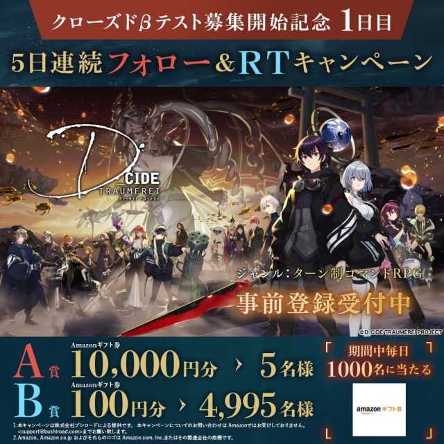 クローズドβテスト募集開始を記念して、6月24日(木)18時より「ディーサイドトロイメライ」公式Twitterにて5日連続フォロー&リツイートキャンペーンを開催いたします!毎日1,000名様に、10,000円または100円分のAmazonギフト券がその場で当たるキャンペーンとなっております。是非クローズドβテストにご応募の上、キャンペーンへもご参加ください!