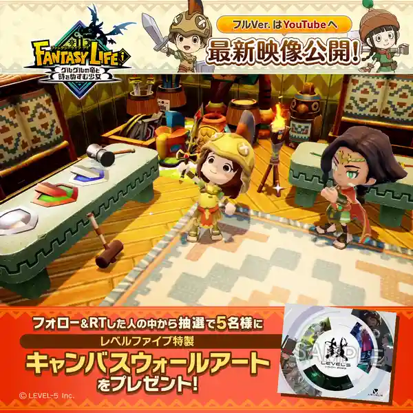「ファンタジーライフ」シリーズ公式Twitter(@L5_fantasylife)では、最新映像の公開を記念して「LEVEL5 VISION 2023 鼓(つづみ)」のビジュアルを使用した、レベルファイブ特製キャンバスウォールアートが当たるキャンペーンを開催!フォロー&該当のツイートをRTしてぜひご応募ください!